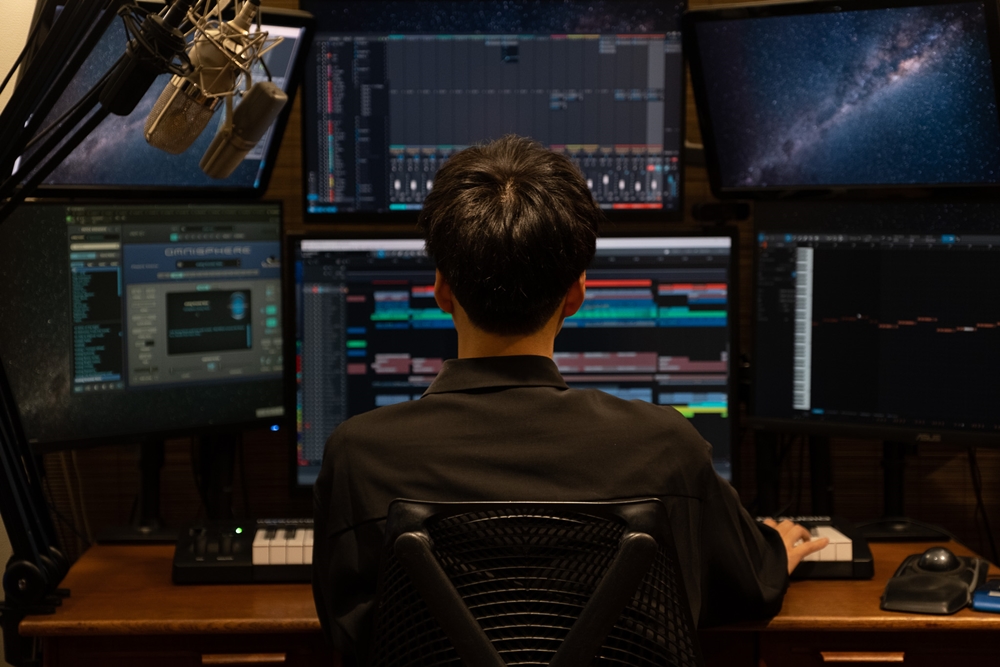 メロディーを作るとことから、アレンジ、打ち込み、レコーディング、ミックス、マスターといった一連の作業をすべてスタジオ内で完結させることができます。レファレンスの音源や、いただいたイメージもとにあらゆるバリエーションの楽曲が制作可能で、それらは著作権フリーで使用していただけます。